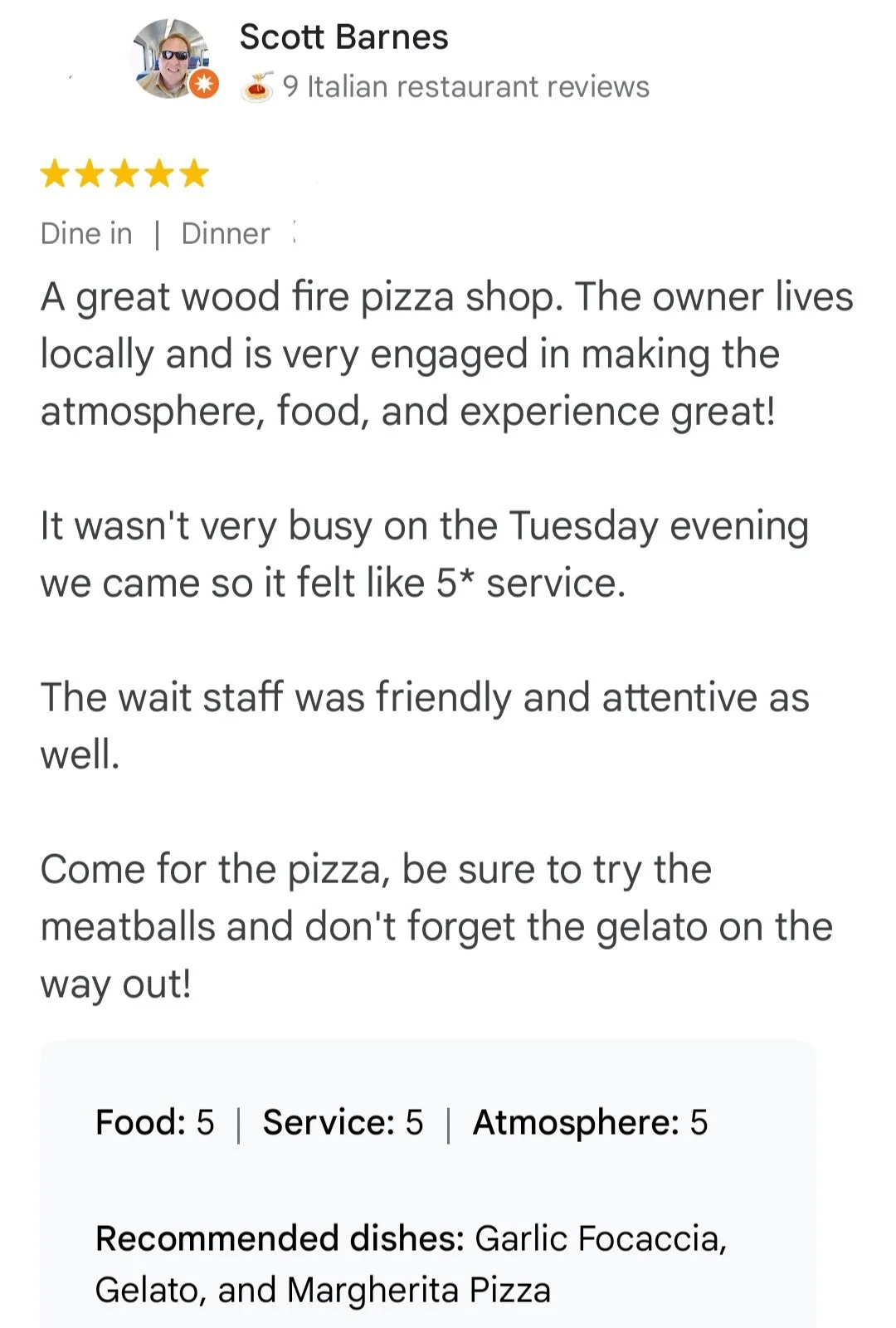 Wood fired pizza is always the way to go! Cute ambiance, with video screens of Italy. Italian music to compliment the theme of the restaurant. Staff is very kind and friendly. Received our food fast!